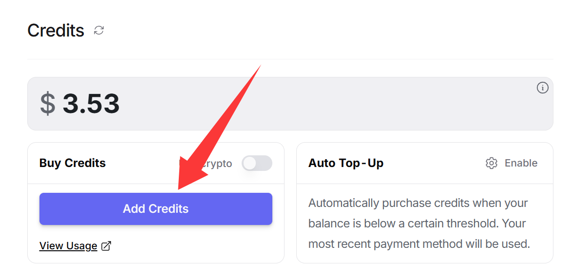 - 点击“Add Credits”,进行充值。需要注意,由于 OpenRouter 会收取一小部分的手续费,付款金额会比实际到账的金额略高一些。